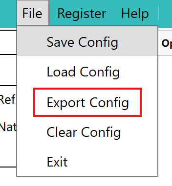 In the top-right menu of the software interface, select File > Export Config and save the configuration file locally. For example, save it as C:\app\config.csop.